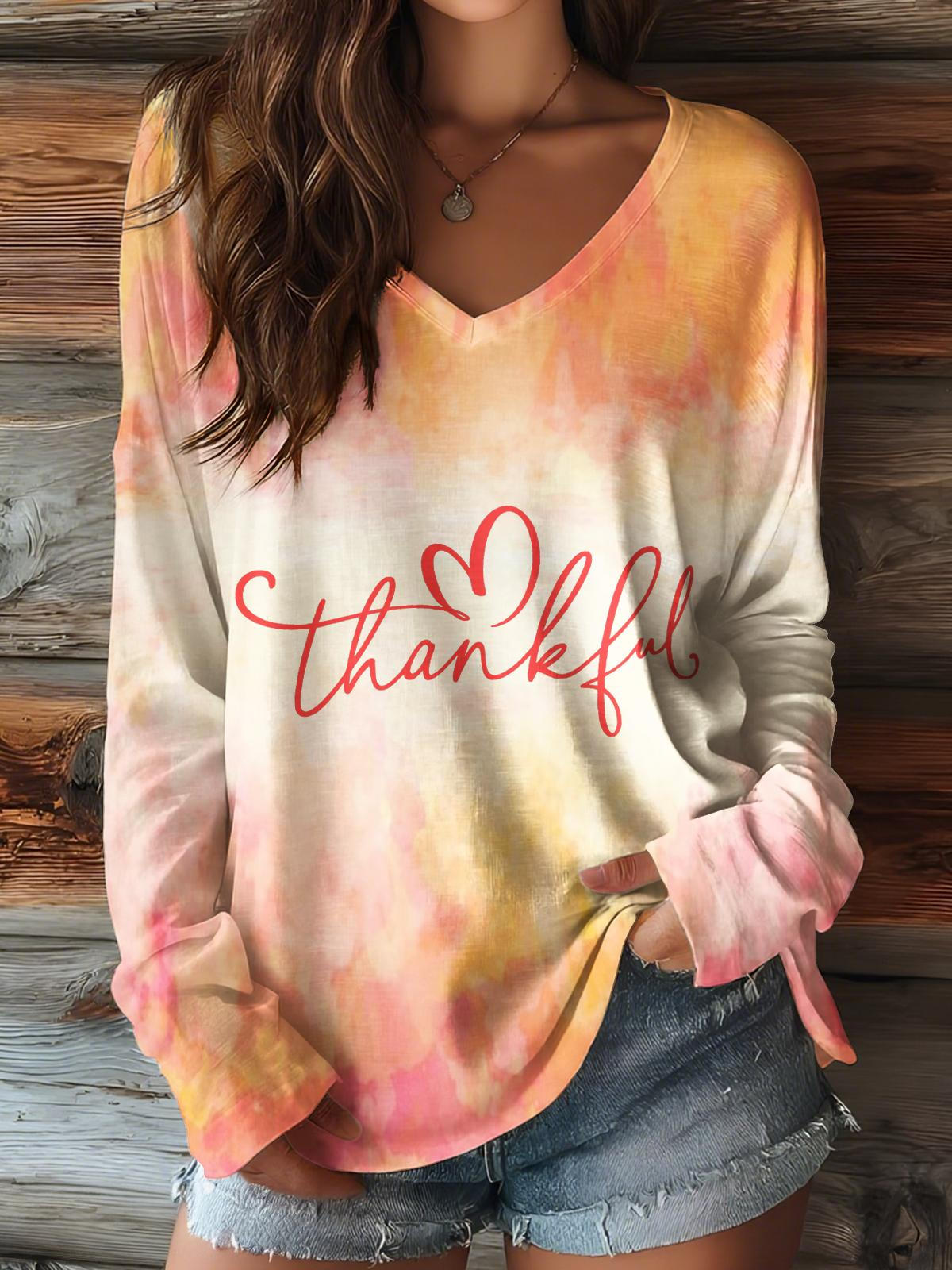 Autumn Thanksgiving Print V-neck Long Sleeve Top