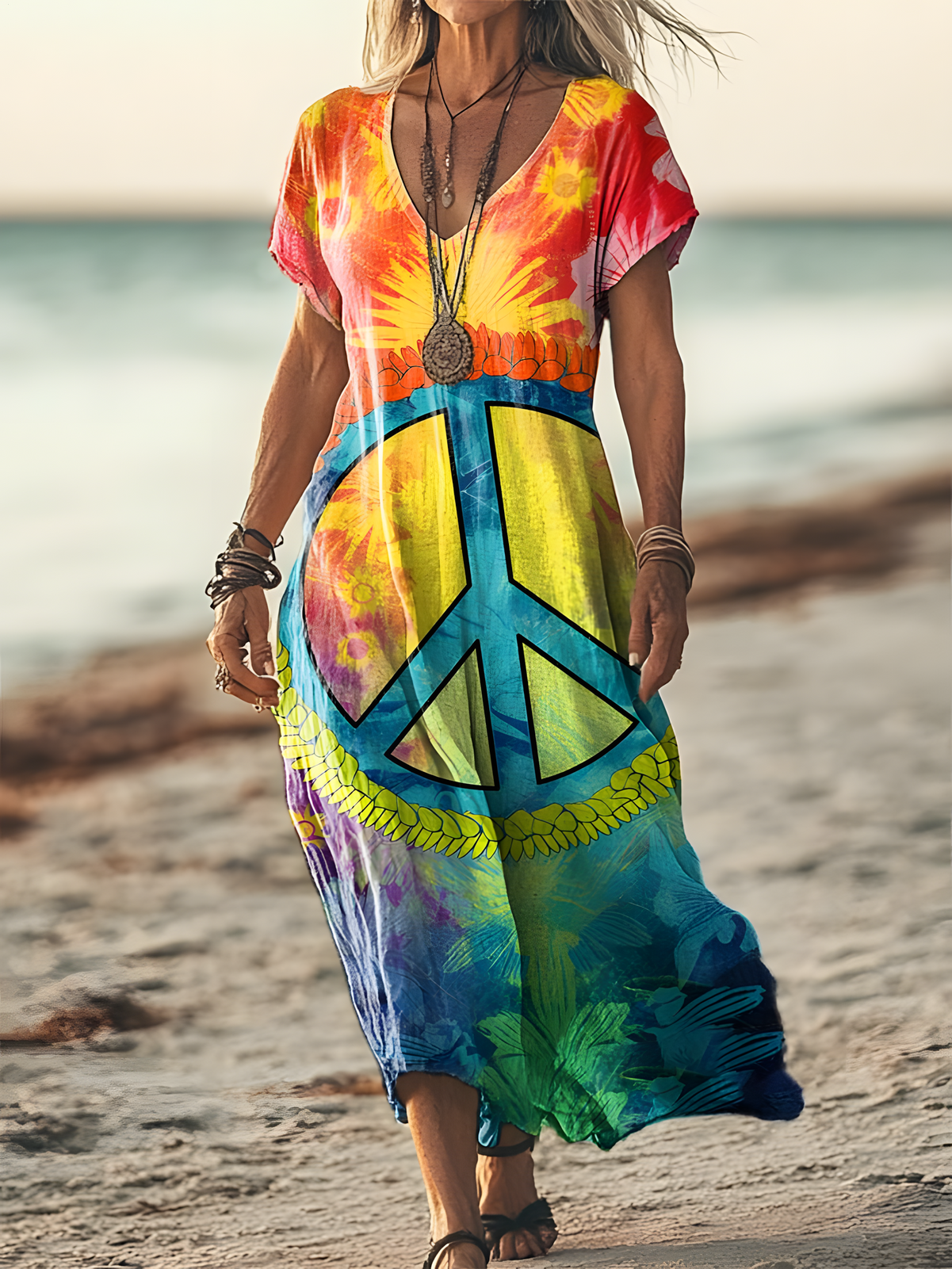 Colorful Hippie Flower Art V-neck Short Sleeved Long Dress