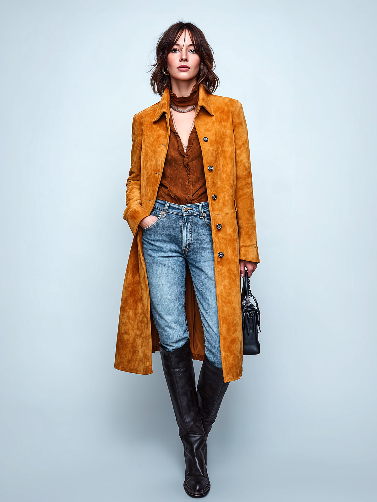 Introducing the Taidalw Chic Vintage Caramel Faux Suede Lapel Single-breasted Long Trench Coat, an epitome of style and sophistication. This timeless piece seamlessly merges vintage charm with modern elegance, making it a perfect addition to your wardrobe.