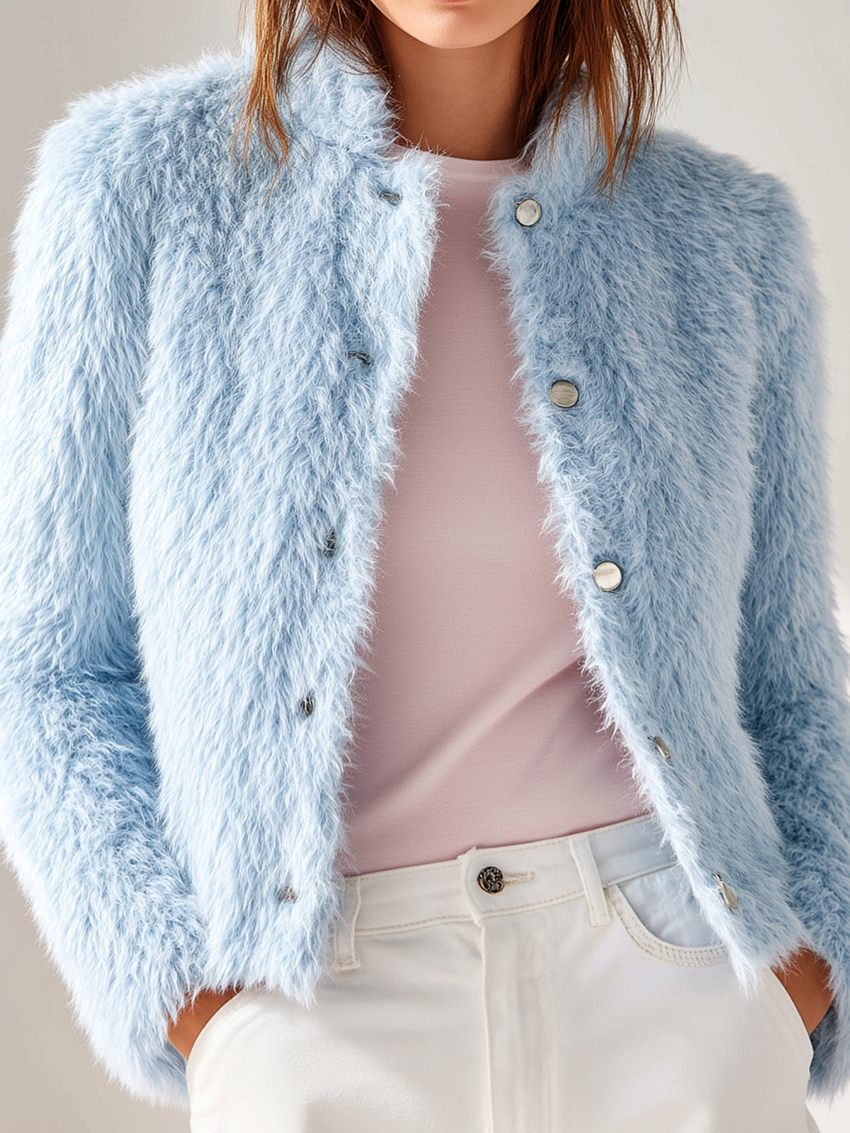 Taidalw Chic Vintage Light Blue Faux Fur Stand Collar Single-breasted Slim Fit Jacket