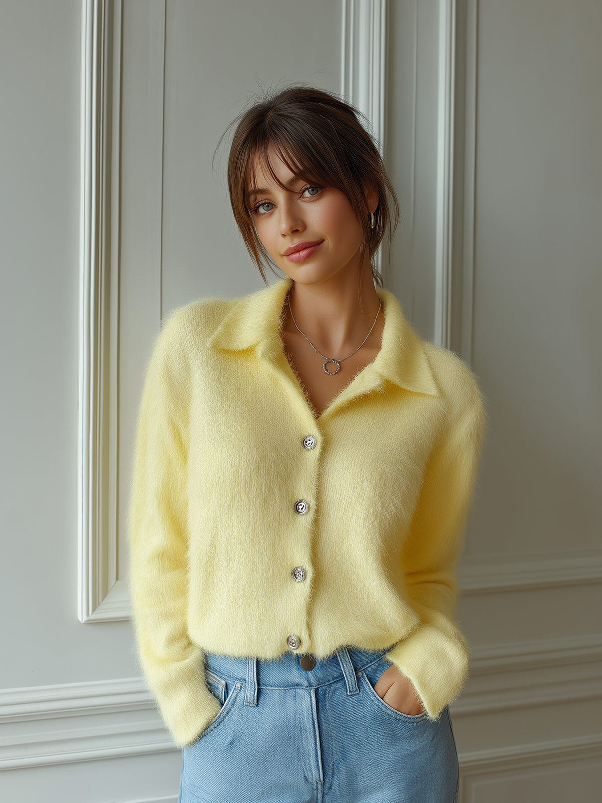 This yellow cardigan pairs well with neutral tones for a balanced look. Wear it over a white blouse and skinny jeans for a casual outing, or drape it over a dress to keep cozy during a chilly evening. Accessorize with statement jewelry or a scarf to elevate the outfit.