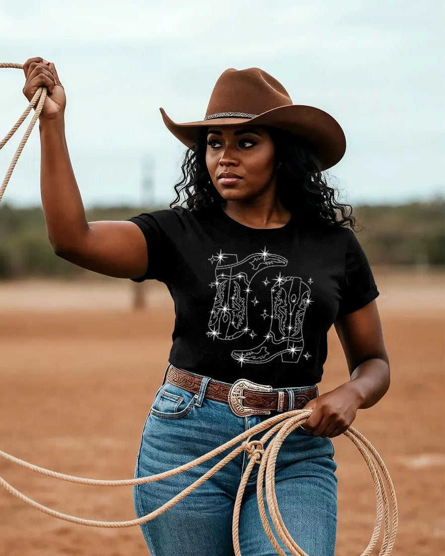 Western crystal Cowgirl Boots Cotton Crew Neck Short Sleeve Tshirt