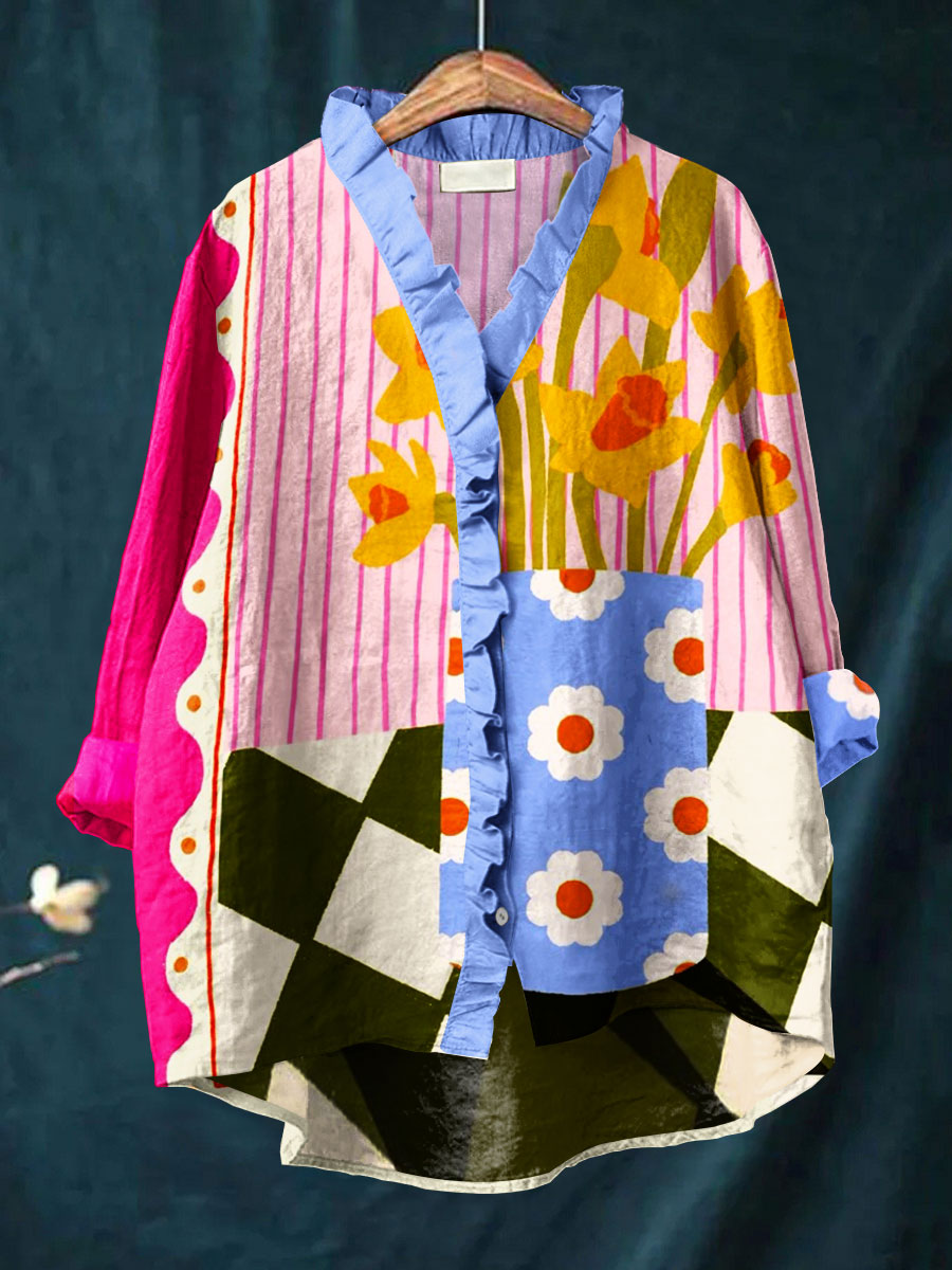 Women's Vintage Abstract Floral Art Print Casual Cotton And Linen Ruffle Shirt