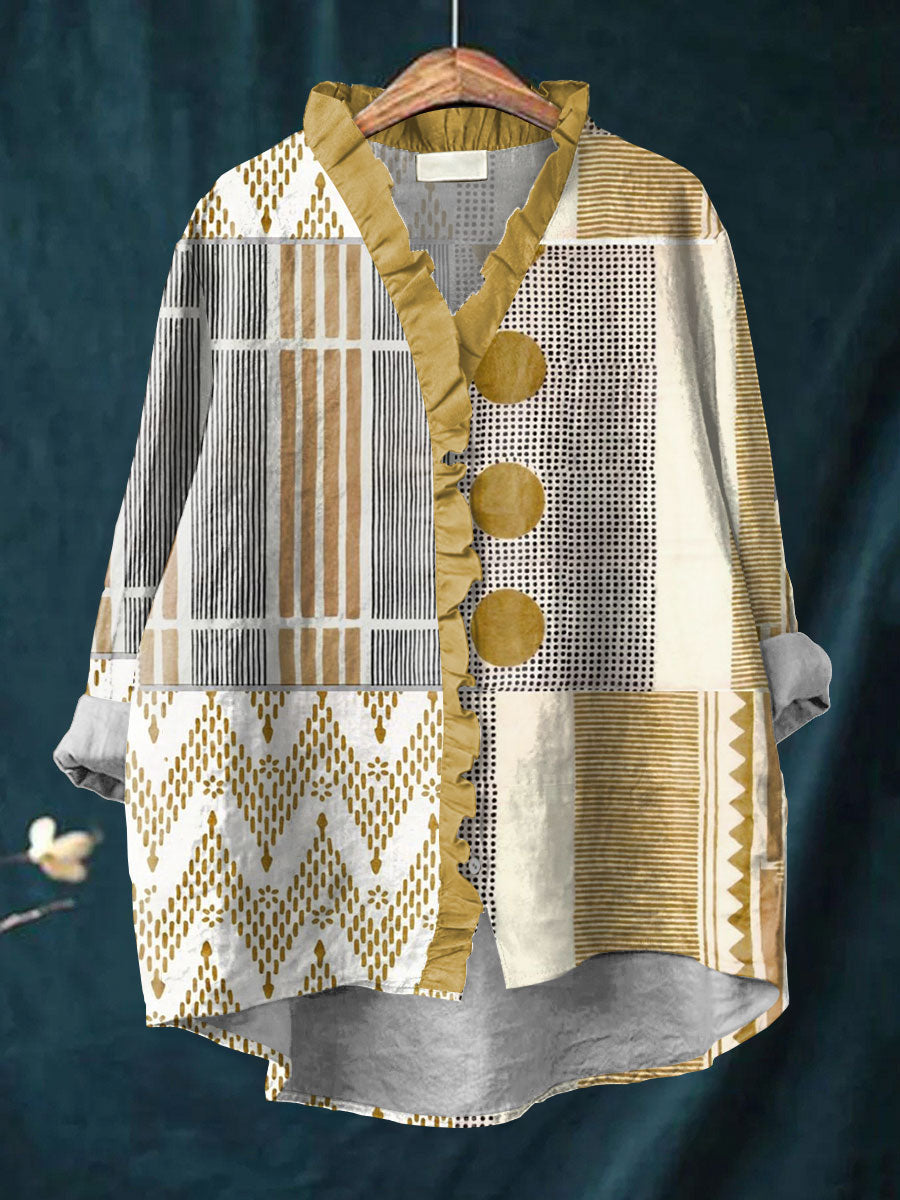 Women's Vintage Abstract Geometric Art Print Casual Cotton And Linen Ruffle Shirt