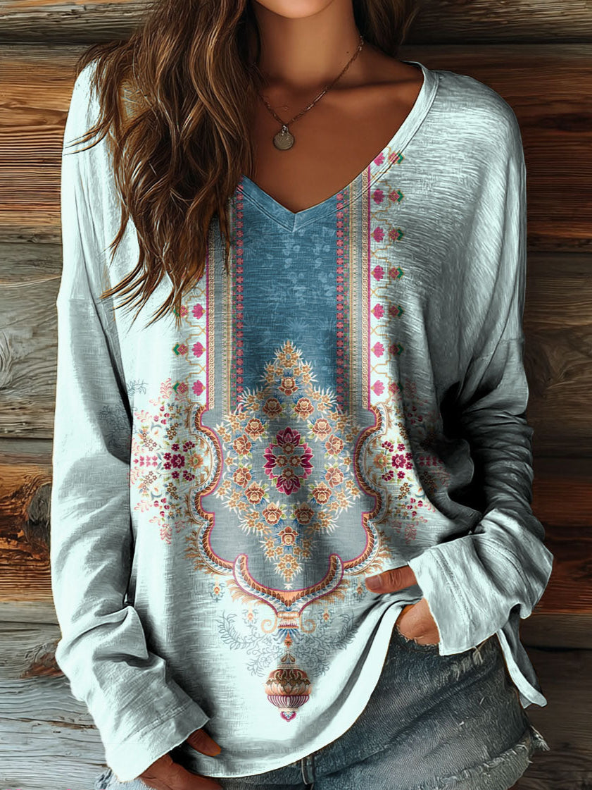 Women's Vintage Ethnic Pattern Artistic Print V-Neck Long-Sleeved T-Shirt