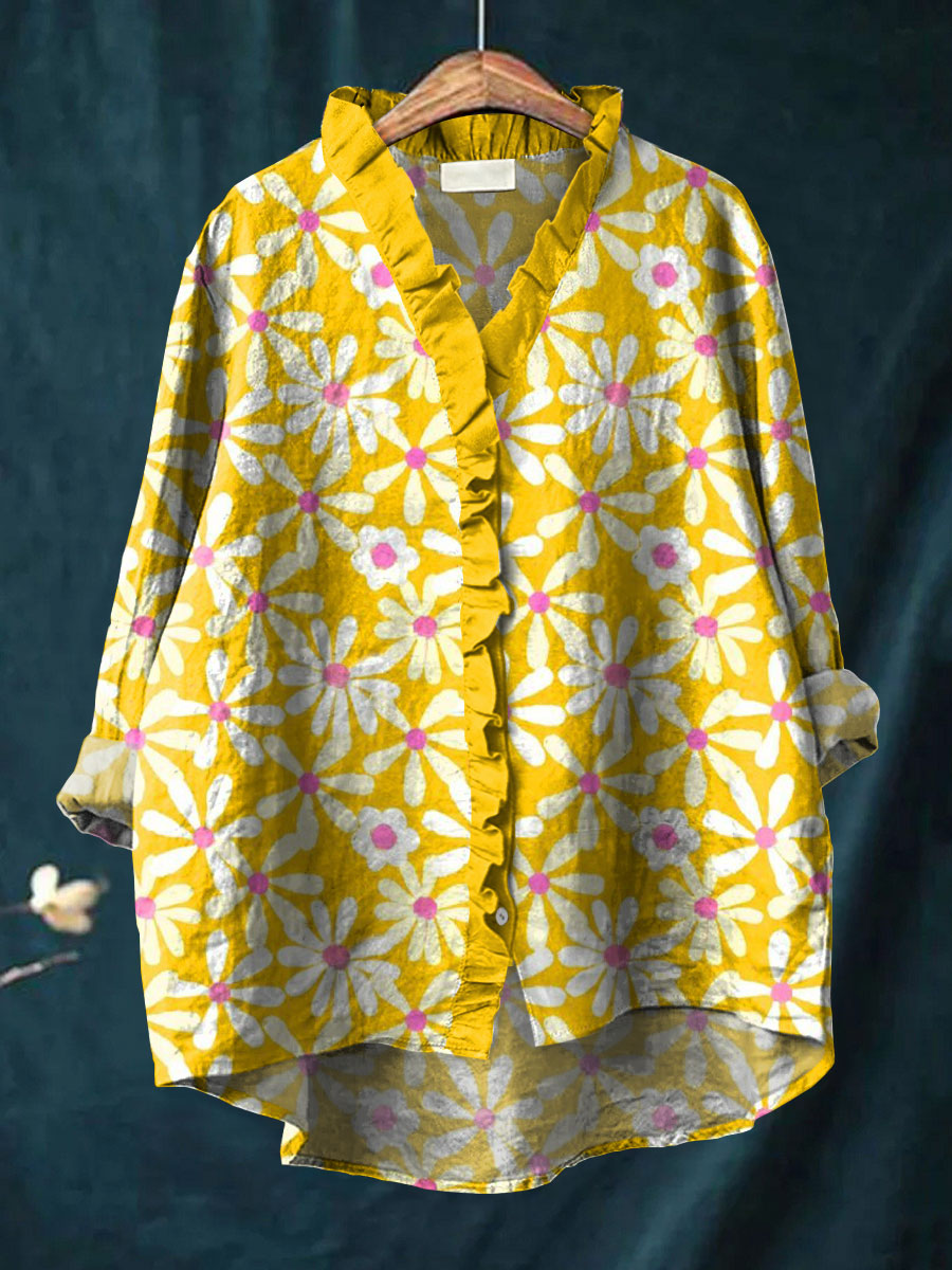 Step into playful vintage vibes with this Women's Vintage Floral Art Print Casual Cotton and Linen Ruffle Shirt. The lightweight cotton and linen blend keeps you comfy while the charming floral design and flirty ruffles add a fun, timeless touch. Perfect for casual outings or sunny weekend strolls, this shirt brings a joyful splash of retro style to your wardrobe.
